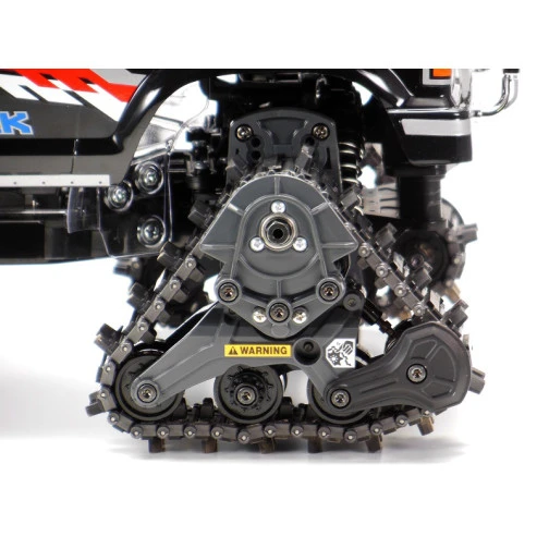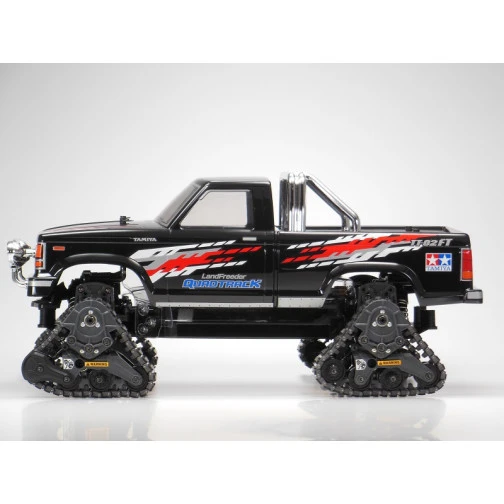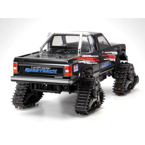 Der Landfreeder Quadtrack ist das erste 1/10 Modell von TAMIYA welches über einen Kettenantrieb verfügt. Bekannt ist diese Antriebsart von Arktis Expeditionsfahrzeugen. Jetzt kombiniert TAMIYA diesen Antrieb mit dem beliebten Landfreeder. Dafür wurde das robuste TT-02 Chassis radikal umgebaut. Anstatt den Rädern besitzt er nun Kettenantriebe. Die Ketten haben eine viel größere Aufstandsfläche als Räder und haben somit mehr Traktion. Das Modell hat weiterhin eine Polycarbonat Chassisabdeckung und Radkästen um es vor Verschmutzungen zu schützen.