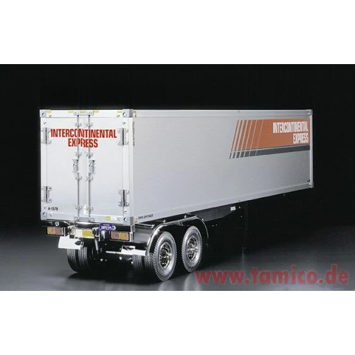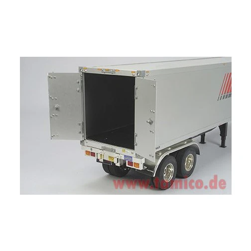 TAMIYA bietet das Modell eines Container Auflieger an, der an die RC-Sattelschlepper im Maßstab 1:14,5 angekuppelt werden kann. Die Hecktüren aus Aluminium lassen sich genau wie beim Original bedienen.